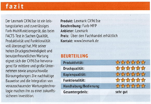 Den FACTS-Standardtest in Sachen Produktivität hat der Lexmark CX963se mit Bravour