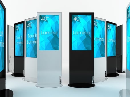 SWEDX Lamina ist das erste freistehende 4K (UHD) Display der Welt. Lamina hat ein 4K Panel, sowie eine Steuereinheit mit u.a. 3 HDMI 2.0 Eingängen, die eine 4K Auflösung mit 60 Hz Bildwiederholfrequenz unterstützen. Dies ermöglicht eine Wiedergabe von Ultra HD Medien (Bilder, Video, Animation). Ultra HD ist die neueste Auflösung. Lamina ist vollgepackt mit durchdachten Funktionen/Eigenschaften für eine maximale Nutzung von Digital Signage, einige hiervon sind: Erstellen von Wiedergabelisten mit Fotos und Videos für eine automatische Wiedergabe Timer für automatisches Ein/Ausschalten SMART HDMI! Die Bildschirme werden abhängig von HDMI Signal ein/ausgeschaltet Große Auswahl an SWEDX Digital Signage Playern (Windows/Android)Große Auswahl an Zubehör (Regale, mobile Basis, Flightcase, usw.)Abschließbare Hintertür für den Schutz der Ausrüstung Platz für die Installation eines Players auf der Rückseite Octanorm Aluminiumprofile für die Montage von Zubehör Lamina ist mit/ohne integriertem Touchscreen (6 Punkte) verfügbar